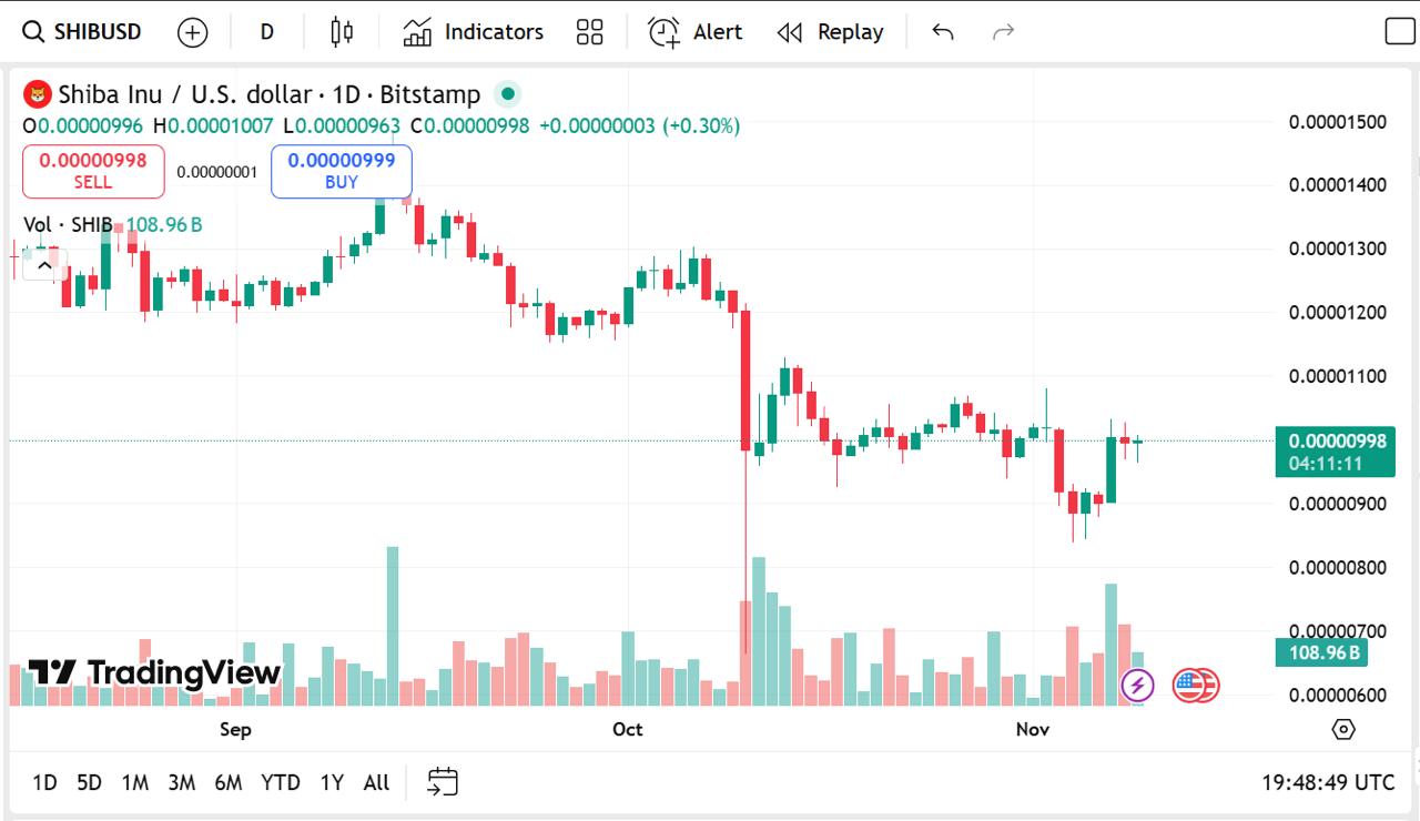 Shiba Inu is currently selling at $0.00000998 following a significant gain of about 1.58% with a market capitalization of $5.87 billion.