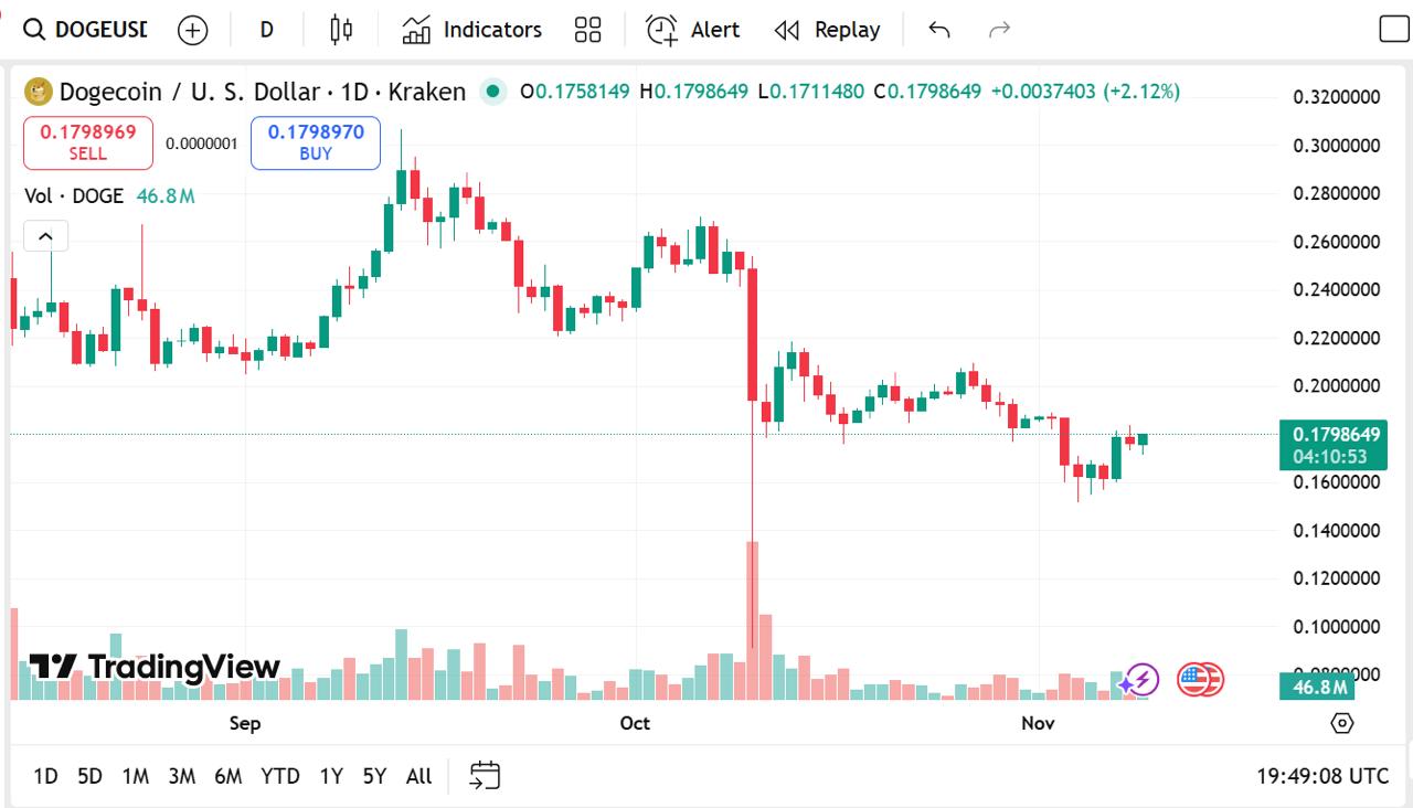 Meanwhile, Dogecoin (DOGE) — still the most popular meme crypto — rose 3.06% to $0.1799. Its market capitalization reached $27.23 billion, even though trading volume declined by 39.06% to $1.48 billion.