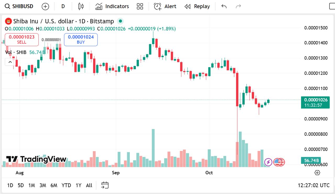 Shiba Inu (SHIB) currently trades at $0.00001023 with a 1.77% climb in the last 24 hours and a market cap of $6.02 billion. The volume has increased to $143.53 million, a sign of long-term retail investor activity.