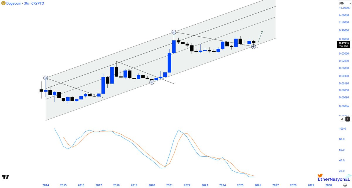 - DOGE trades in the lower band of its long-term ascending channel — often a historical buy zone.