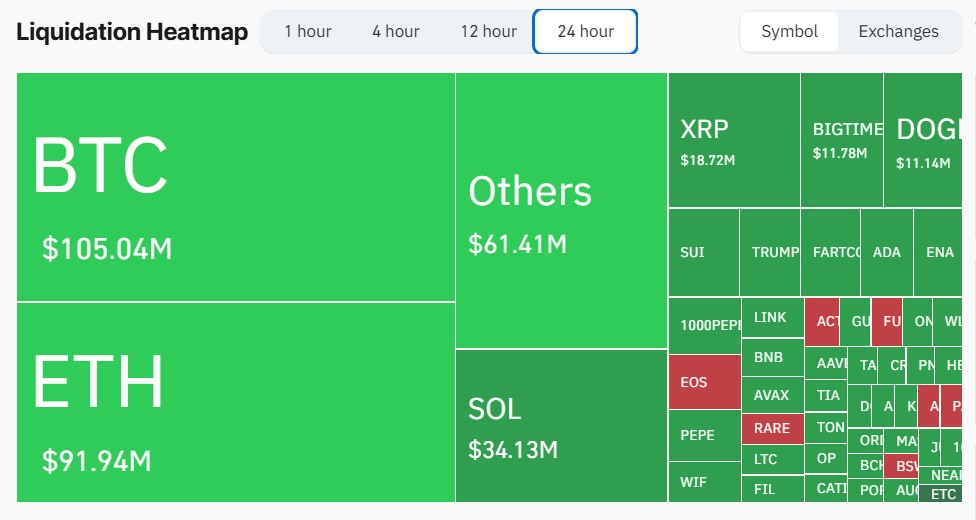 While Bitcoin and Ethereum led the overall sell-off, SOL and DOGE experienced the highest liquidations within the altcoin market. Solana saw $34.13 million in liquidations, with long traders losing $29.48 million and short traders losing $4.66 million.