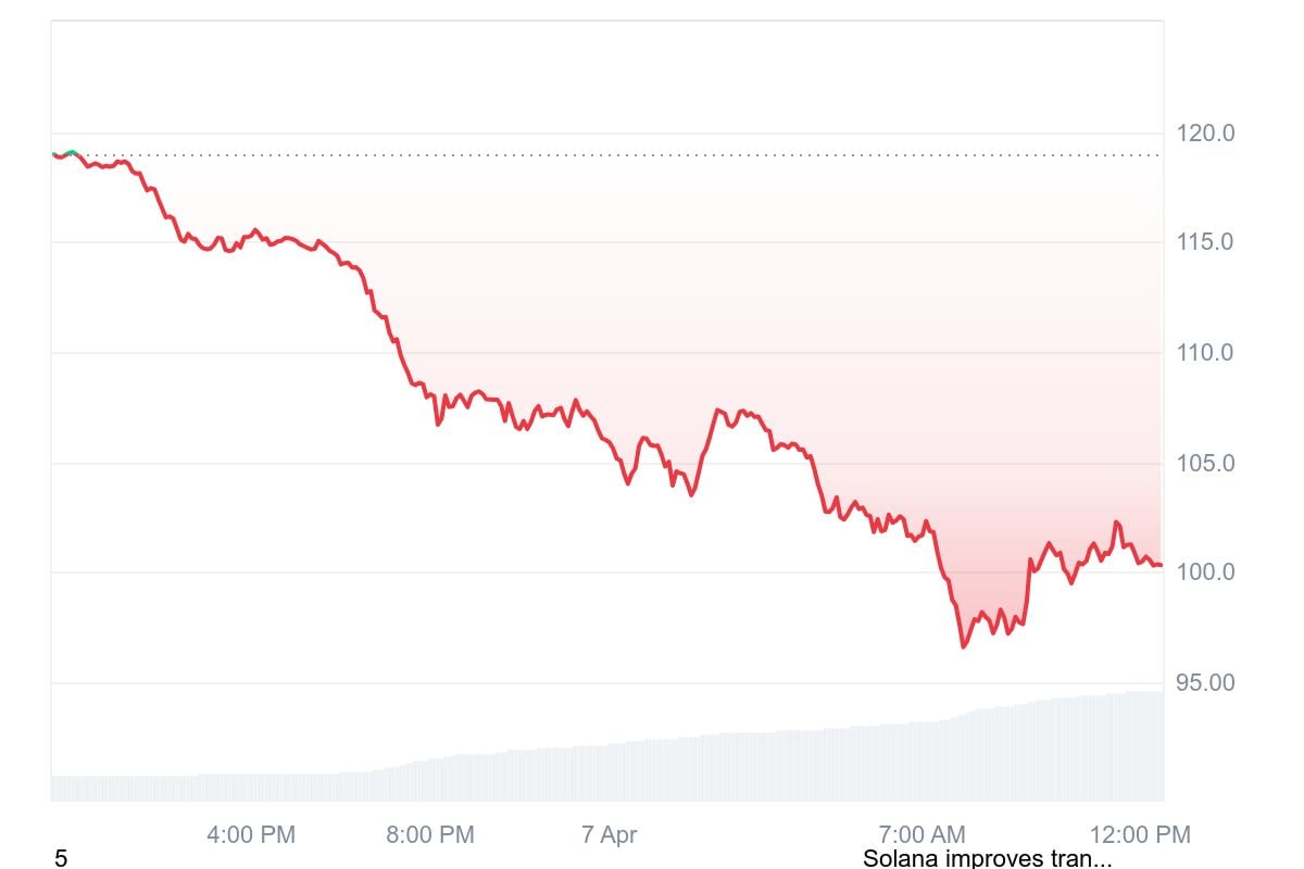 Currently, trading volume is driving a shift in Solana sentiment, with the price decline slowing. SOL is trading at $101.21, down 14.77% in the last 24 hours.