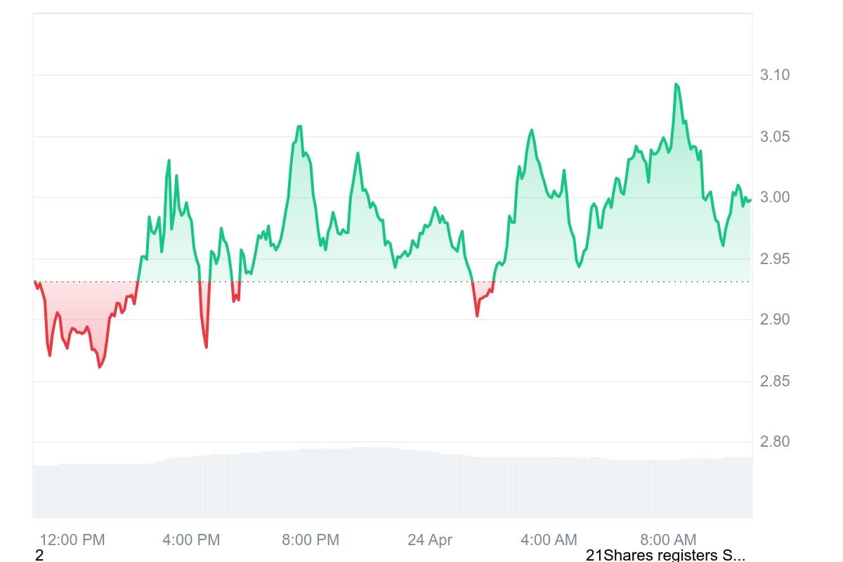 According to CoinMarketCap, SUI rose 1.56% to $2.96. Earlier trading saw a surge exceeding 2%, briefly reaching $3.13 before a minor correction.