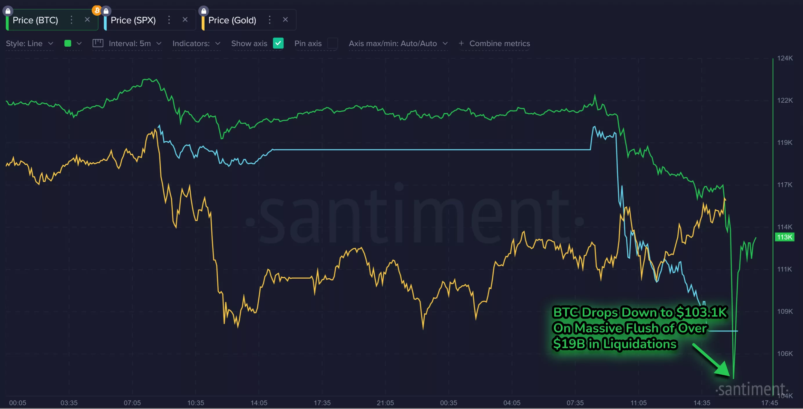 Bitcoin (BTC) dropped from approximately $124,000 to briefly touch $104,100 in a matter of hours before rebounding to $113,000.