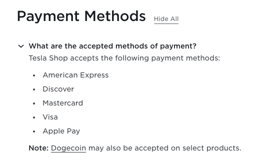 ,The electric car giant Tesla recently announced that it will now take Dogecoin as payment for several products, which is a big step toward integrating cryptocurrencies with traditional commerce.