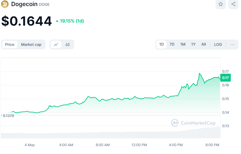 As per the data of CoinMarketCap, the price of dogecoin has jumped to $0.16 and in the last 24 hours the price increased by about 20%.