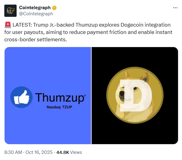 Also Read: Trump Jr.-Backed Thumzup Approves $10M Buyback as Bitcoin and Dogecoin Treasury Expands