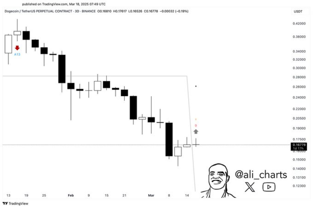 Dogecoin (DOGE) may be nearing a turning point. A buy signal from the TD Sequential indicator on its three-day chart suggests the recent downtrend might be weakening, potentially paving the way for a price recovery. This signal, noted by crypto expert Ali on X (formerly Twitter), indicates DOGE is "primed for a bounce" after a significant bearish period. The TD Sequential buy setup, often interpreted as a sign of exhausted selling pressure, has captured the attention of market observers.