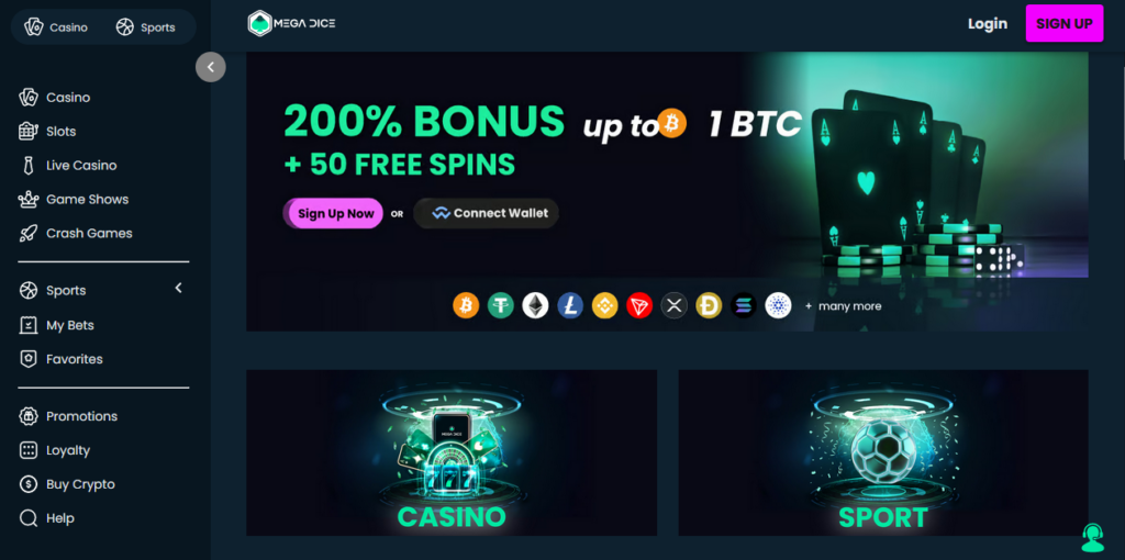 - Overview: Launched in 2023, Mega Dice has rapidly gained popularity as a crypto casino and sportsbook. It operates under a Curacao eGaming license and holds an additional license from the Anjouan Gaming Board, ensuring a regulated and secure betting environment. A distinctive feature of Mega Dice is its innovative Telegram integration, allowing users to access games and betting directly through the messaging app.