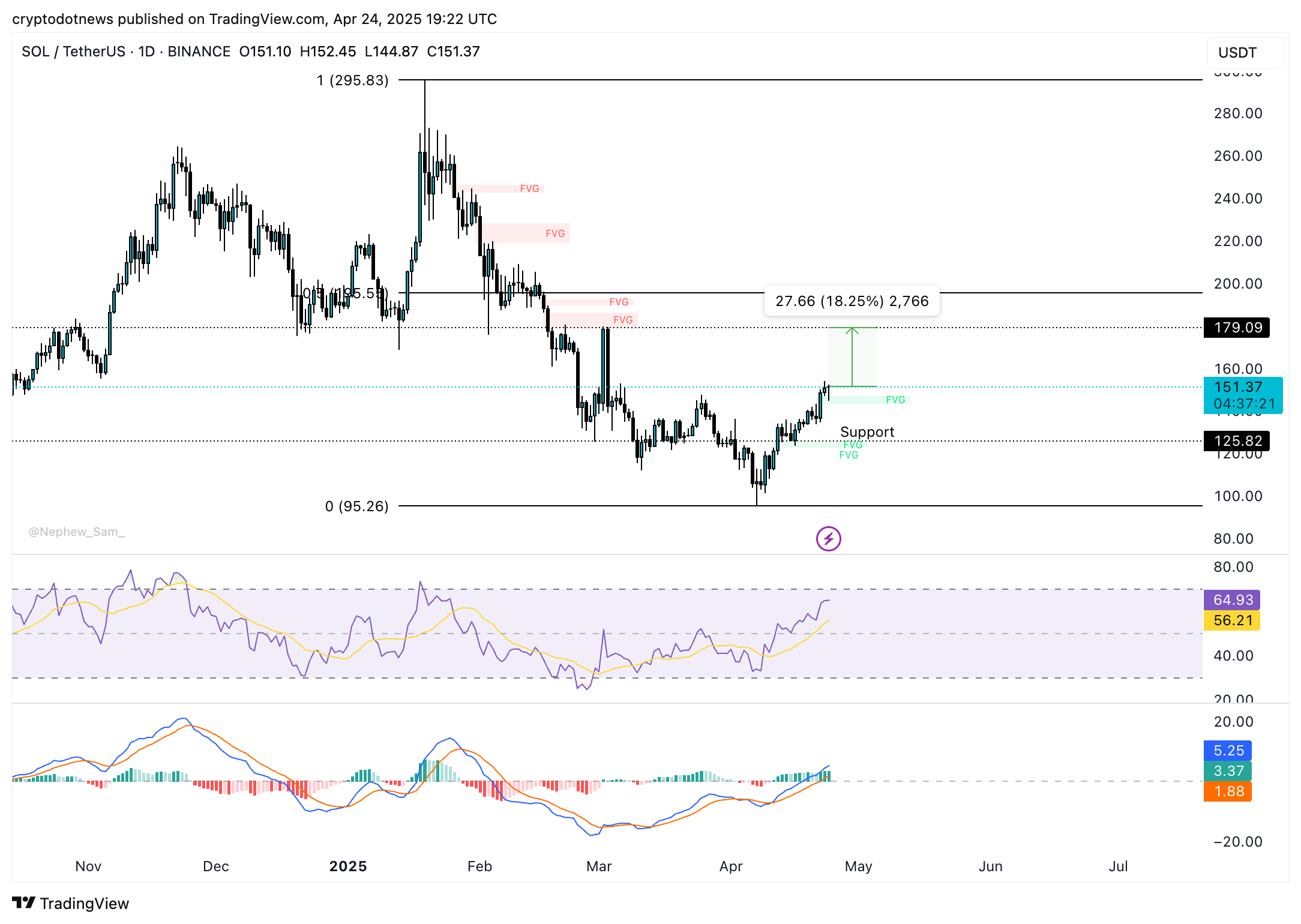 Solana's daily chart shows similar positive RSI (64, sloping upwards, below the "overbought" level of 70) and MACD indicators. An 18% gain could take SOL to $180, with a daily close above this level potentially signaling an upward trend. $125 serves as key support.