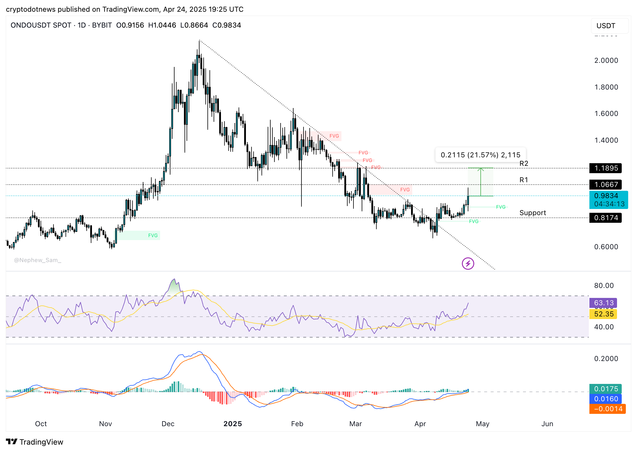 ONDO could also break out of its consolidation phase. A daily close above $0.98 could confirm an upward trend, potentially leading to a 21% rally to $1.1895. $1.0667 acts as intermediate resistance, while $0.8174 provides support.