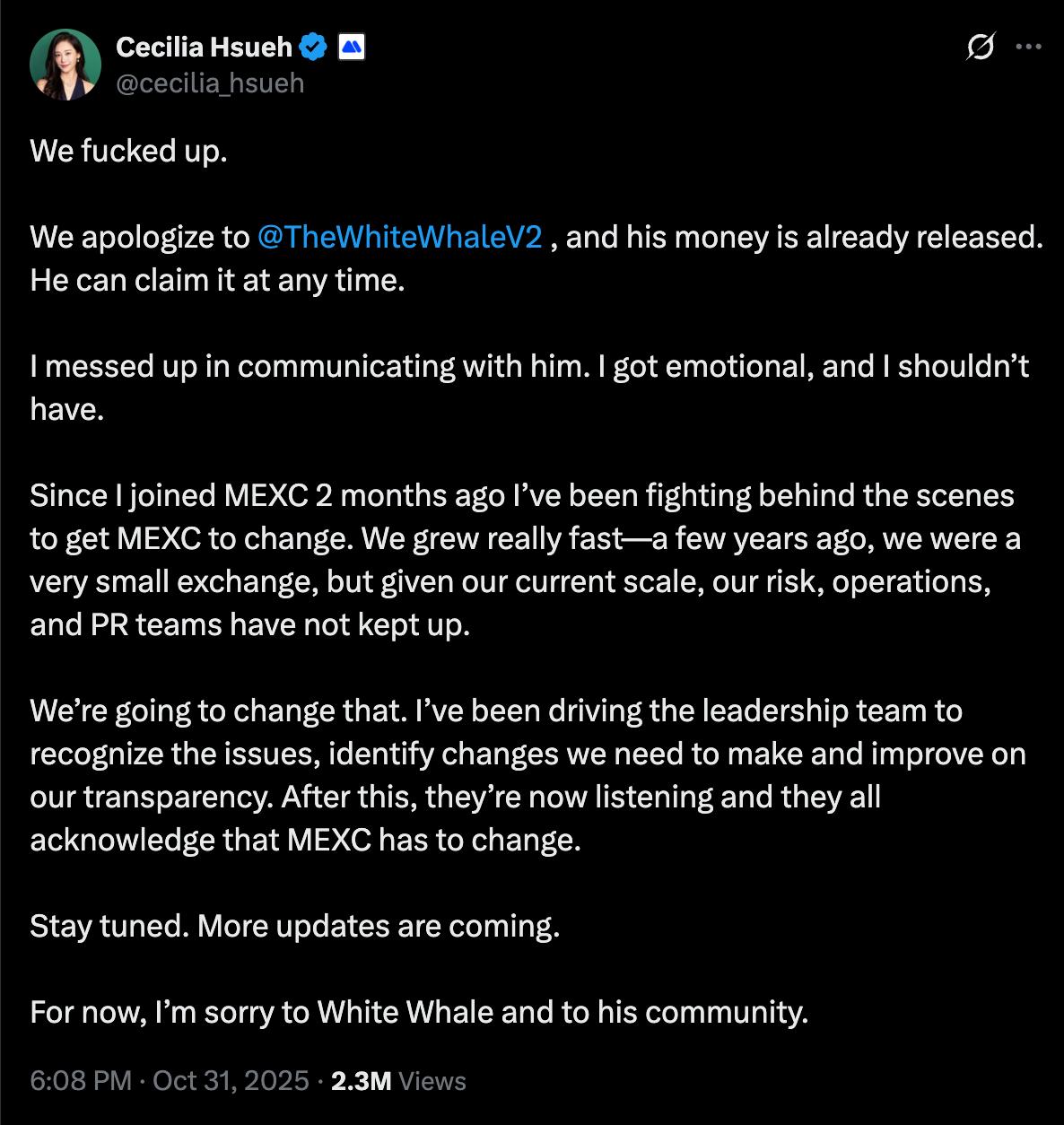 In a post on X, MEXC’s Chief Strategy Officer Cecilia Hsueh admitted the exchange mishandled the situation. “We f***ed up,” she wrote. “His money is already released. He can claim it at any time. I messed up in communicating with him.”