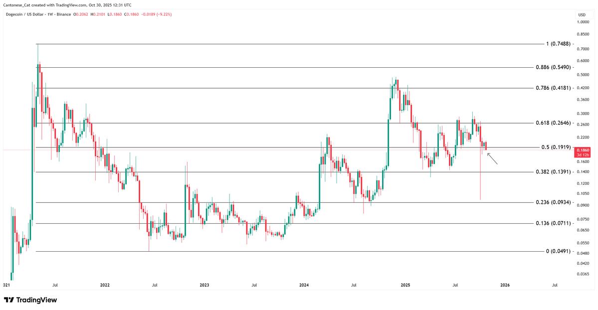 Dogecoin is quietly building momentum. Price sits near $0.18 on November 1, and while social buzz has cooled, the chart is heating up. For four weeks straight, DOGE has tested the 0.5 Fibonacci level at $0.1919, a zone known for sharp reversals.