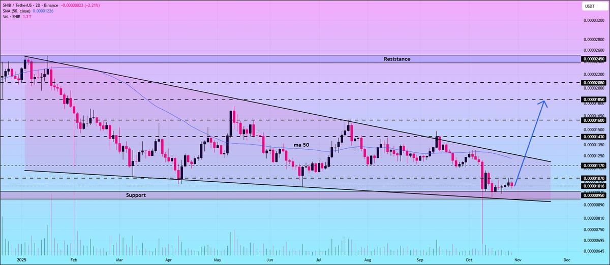 While SHIB is currently consolidating around $0.00001015, traders are eyeing a falling wedge on the two-day chart. According to analyst Profit Demon, targets sit at $0.00001170, $0.00001430, and as high as $0.00001850 if bulls take control.