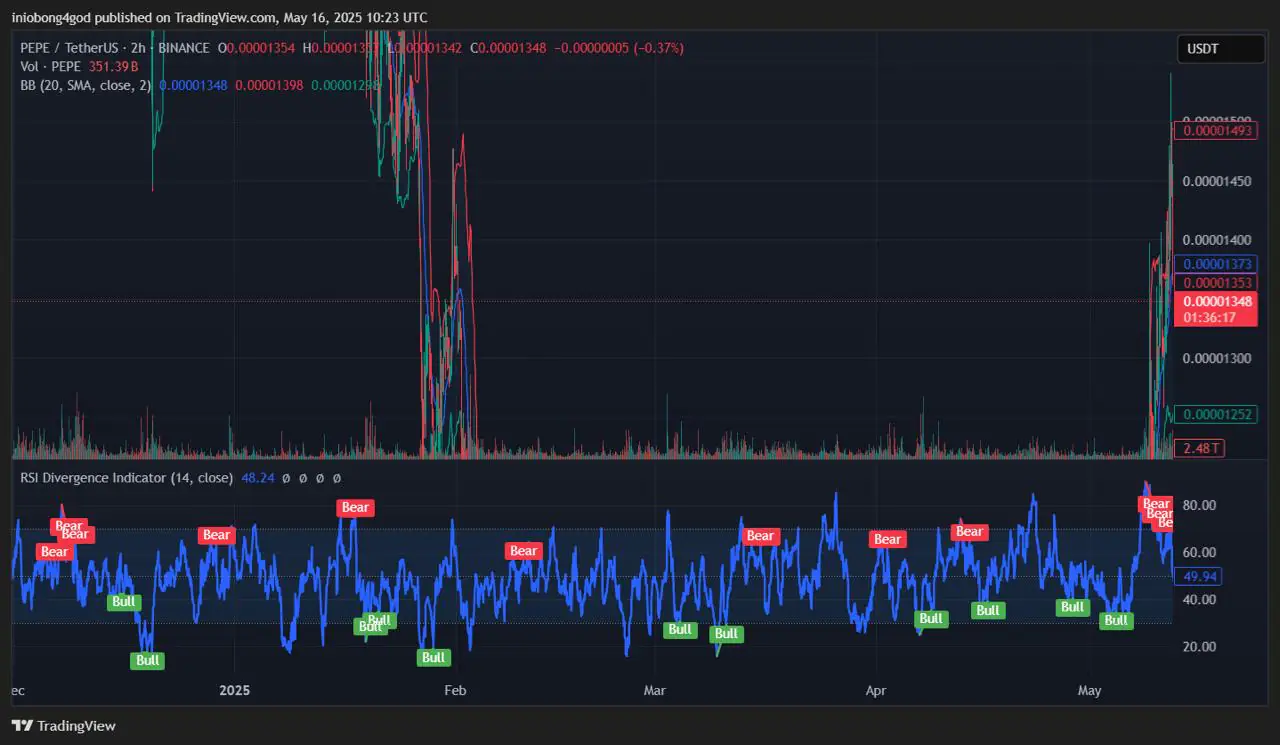 Pepecoin (PEPE) has seen remarkable growth in May, exceeding 90% month-to-date and trading at $0.0000134. Despite strong bullish sentiment (Greed score of 71), technical indicators like RSI divergence and a breakout above the upper Bollinger Bands suggest a possible reversal.
