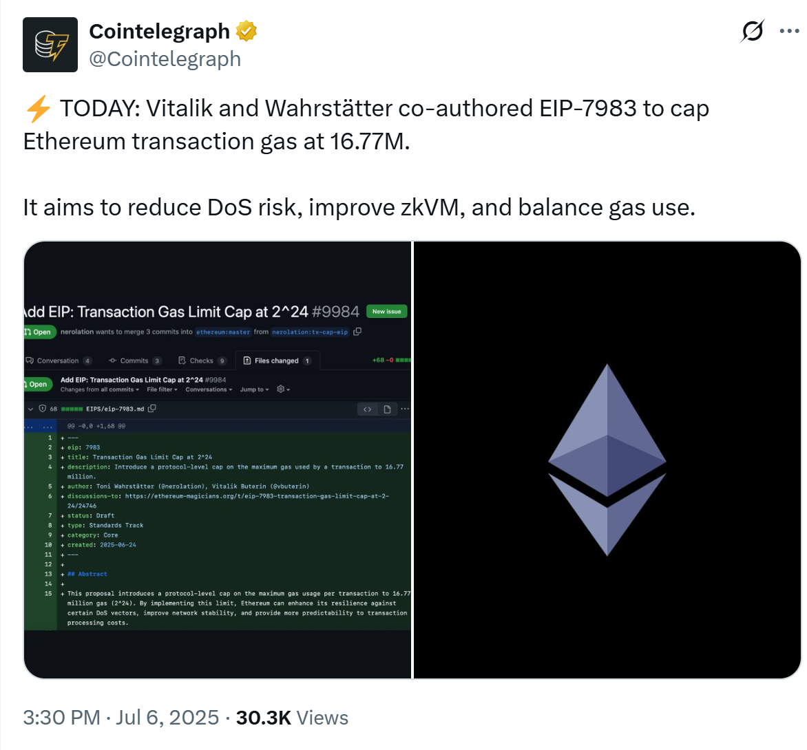 Ethereum co-founder Vitalik Buterin and researcher Toni Wahrstätter have proposed EIP-7983, an initiative designed to enhance network security and performance by introducing a protocol-level cap on transaction gas usage.