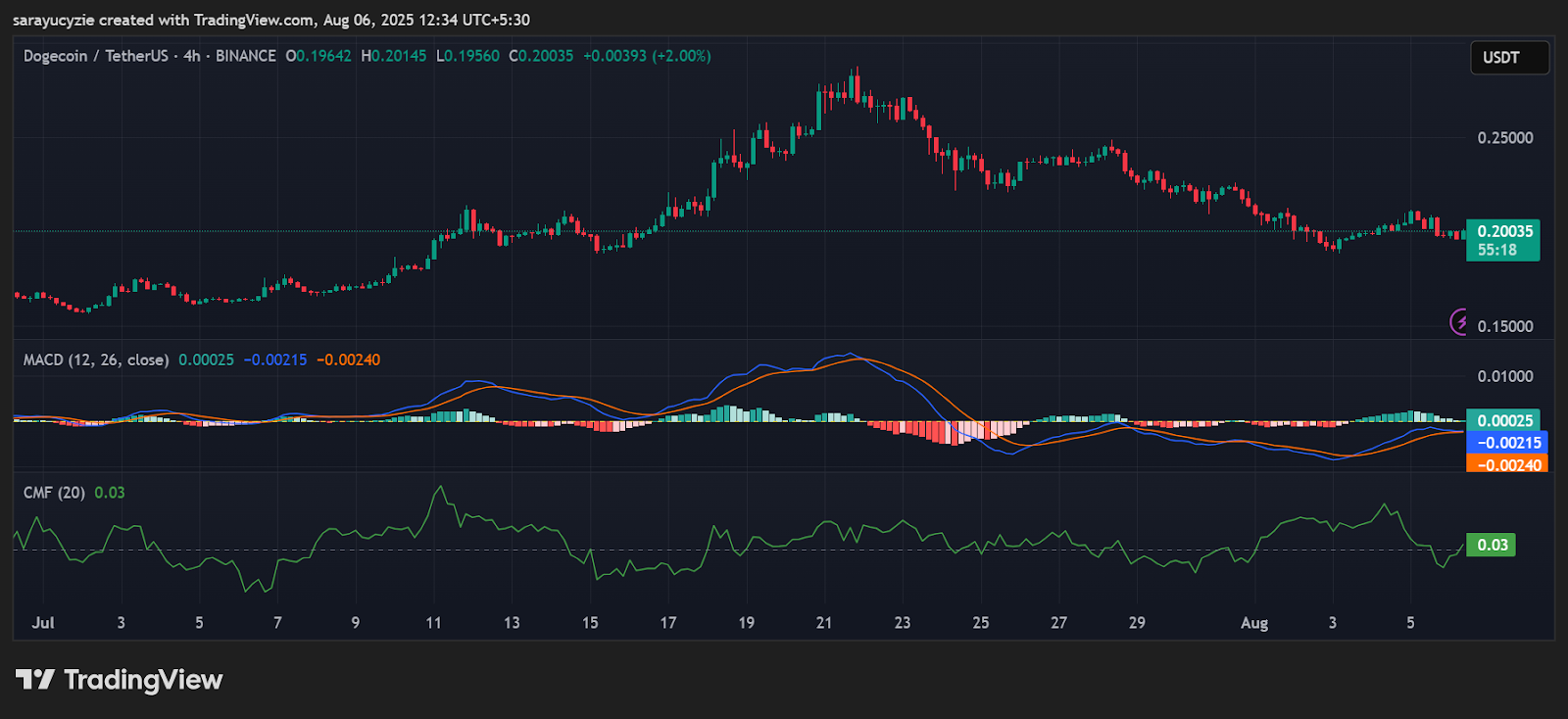 Early trading patterns showed DOGE reaching a high of $0.2086, before bearish pressure pushed the price down to a low of $0.1957. Currently, DOGE is trading around $0.2012.