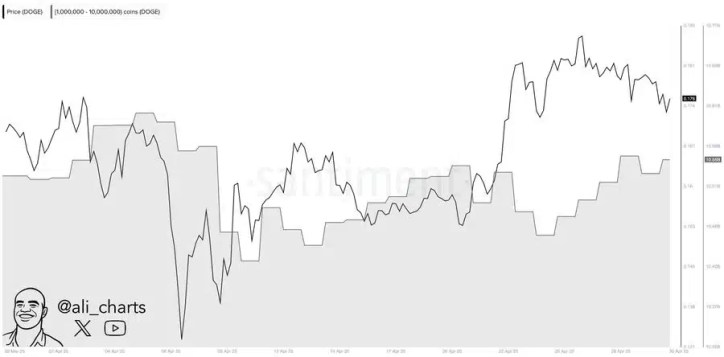 On-chain data, as reported by Ali Martinez on X, shows that total holdings in this wallet category increased from approximately 10.42 billion DOGE to over 10.55 billion DOGE by April 30th. This notable increase happened during a period of market stability and low social media influence on prices.