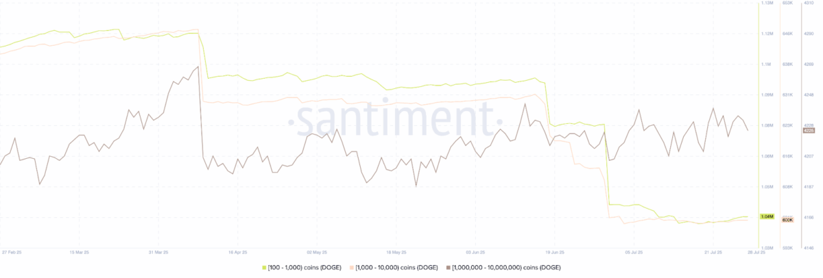 In July, whales holding between 1 million and 10 million DOGE maintained their positions and slightly increased them as per the data. These bigger players seem to have confidence in the market’s fluctuations.