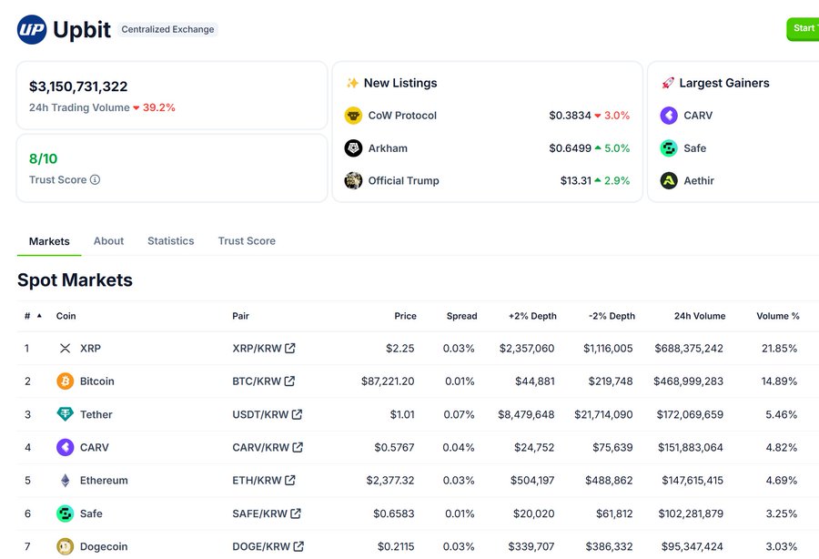 Upbit, South Korea's largest cryptocurrency exchange, reported a remarkable 24-hour trading volume of $3.15 billion, with XRP significantly leading the activity. The XRP/KRW trading pair alone contributed $803 million, representing 22.73% of the total volume.