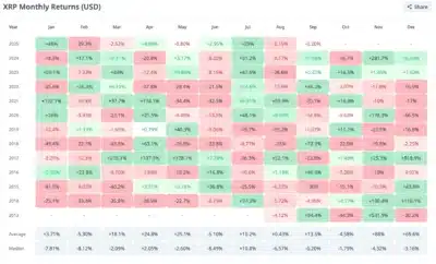 XRP has seen several significant rallies in October, but these tend to be exceptions rather than the rule. In fact, its median monthly return for October is negative. This contradicts the idea that October consistently delivers positive returns for XRP.