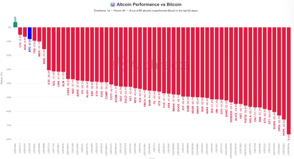 Over the past year, Ripple's XRP has significantly outperformed Bitcoin and other leading cryptocurrencies, achieving a 315% increase. Data from the past 60 days reveals XRP as one of only three altcoins with positive returns against Bitcoin, which experienced an 8.39% decline during the same period.