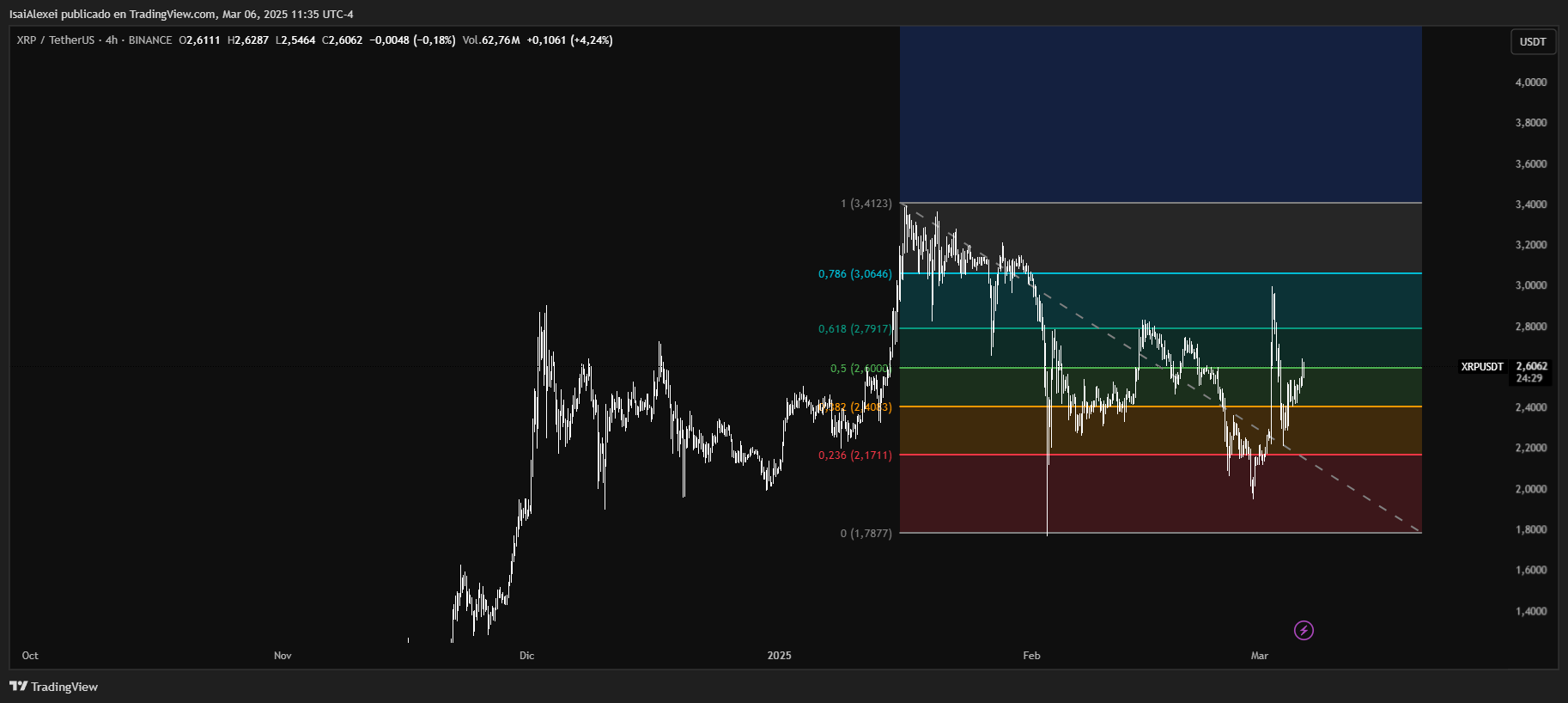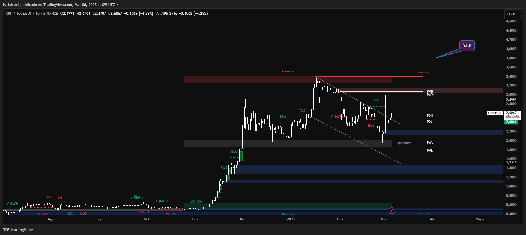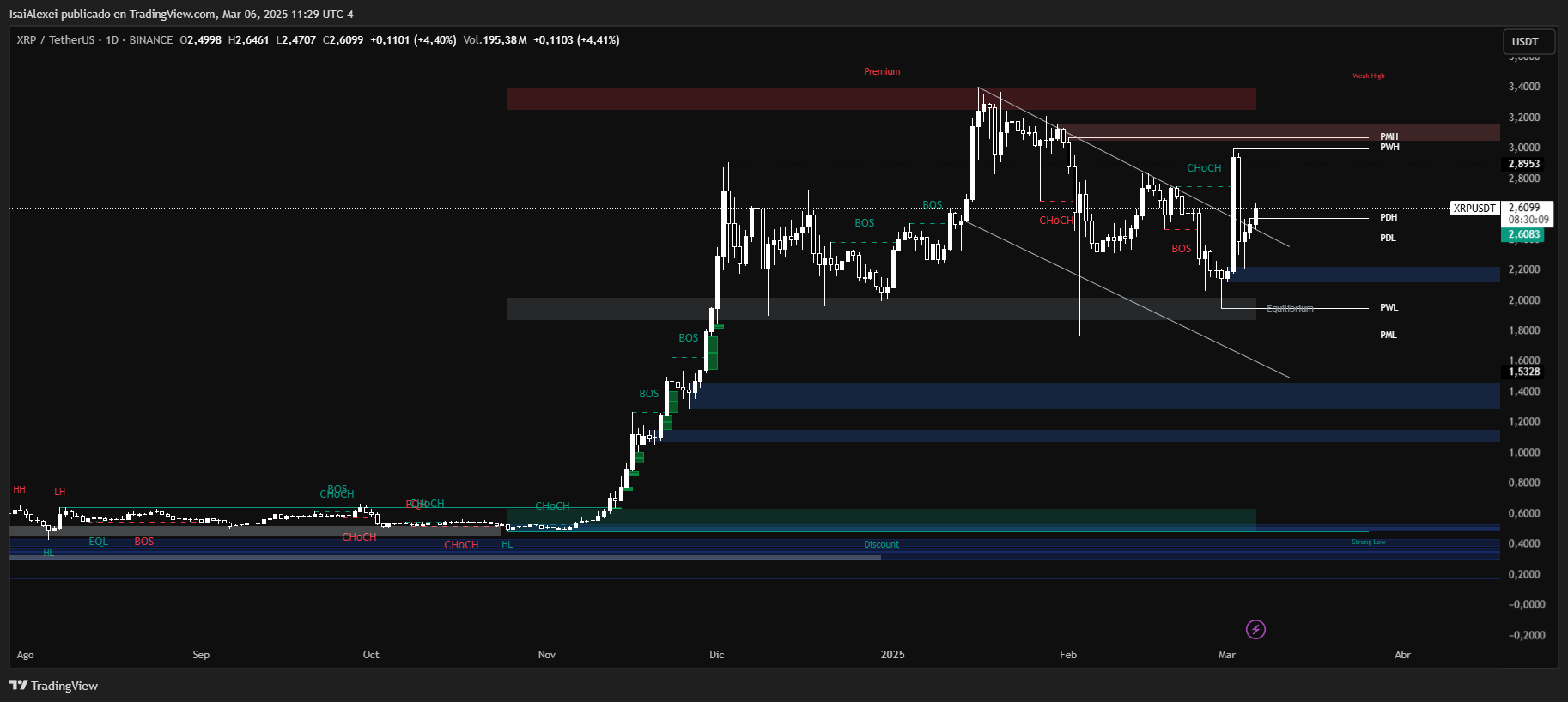 XRP is currently trading at $2.6065, representing a 4.26% daily increase. Over the past week, it has surged 18.56%, although it remains down 3.63% for the month. The long-term trend remains bullish, with gains of 400.90% over six months and 340.09% over the past year. Despite this positive trend, XRP has exhibited significant volatility, recently spiking 50% to $3.00 before retracing.