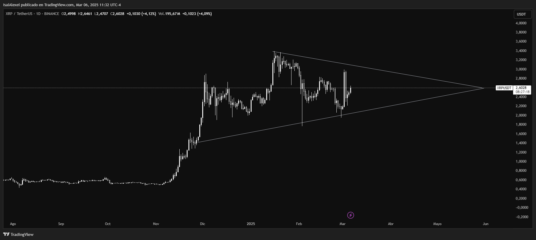 Technically, XRP is currently undergoing a pullback after testing resistance near its all-time high (ATH) of $3.40. Current price action suggests a consolidation period, with a symmetrical triangle pattern forming. A break above key resistance levels could signal a continuation of the uptrend.
