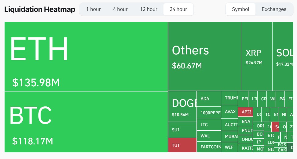 Altcoins are leading the 24-hour liquidation trend, with Ethereum topping the list at $136.13 million. XRP saw the highest altcoin liquidations at $24.97 million, predominantly from long positions ($23.68 million) with minimal short liquidations ($1.16 million). This imbalance, while not unprecedented, has disappointed bullish traders. Instead of the predicted price increases, the market moved in the opposite direction.