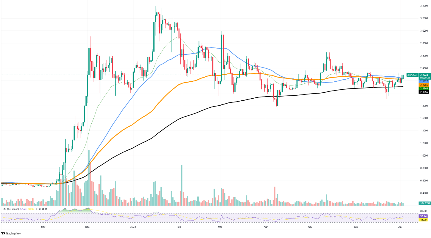 The Relative Strength Index (RSI) has risen to 57, indicating growing buying strength. As XRP trades above all major moving averages, a "golden cross" formation may occur if shorter-term averages cross above the longer-term ones. The 100-day and 200-day EMAs remain within reach. Following such a move, a push towards the $2.50 region may soon materialize, followed by a test of the psychological resistance level at $3.