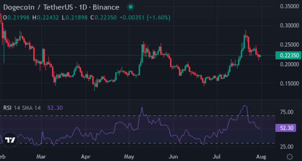 Dogecoin is currently trading between $0.21 and $0.28. The price decreased by 7.3% this week, following a significant 34.56% increase over the past month. Despite this recent gain, it remains approximately 32% lower than its value six months ago.