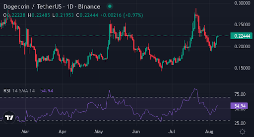 Over the past week, DOGE has increased by 7.73%, and in the last month, it has added 32.92%. Despite this increase, the coin is still 10.76% lower than it was six months ago. The price currently fluctuates between 0.18 and 0.24, hovering around the 10-day average at 0.22 and remaining just above the 100-day line at 0.21.