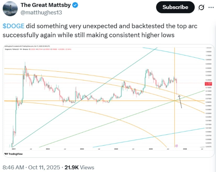 The popular meme crypto Dogecoin (DOGE) continues to demonstrate resilience despite past downturns. After facing a 22% dip, DOGE currently trades near $0.18, supported by a falling wedge formation that points to a possible short-term bounce. Analysts foresee a potential rally toward $0.24, although the sentiment remains cautious as capital flows into utility-based projects rather than purely meme-driven assets.