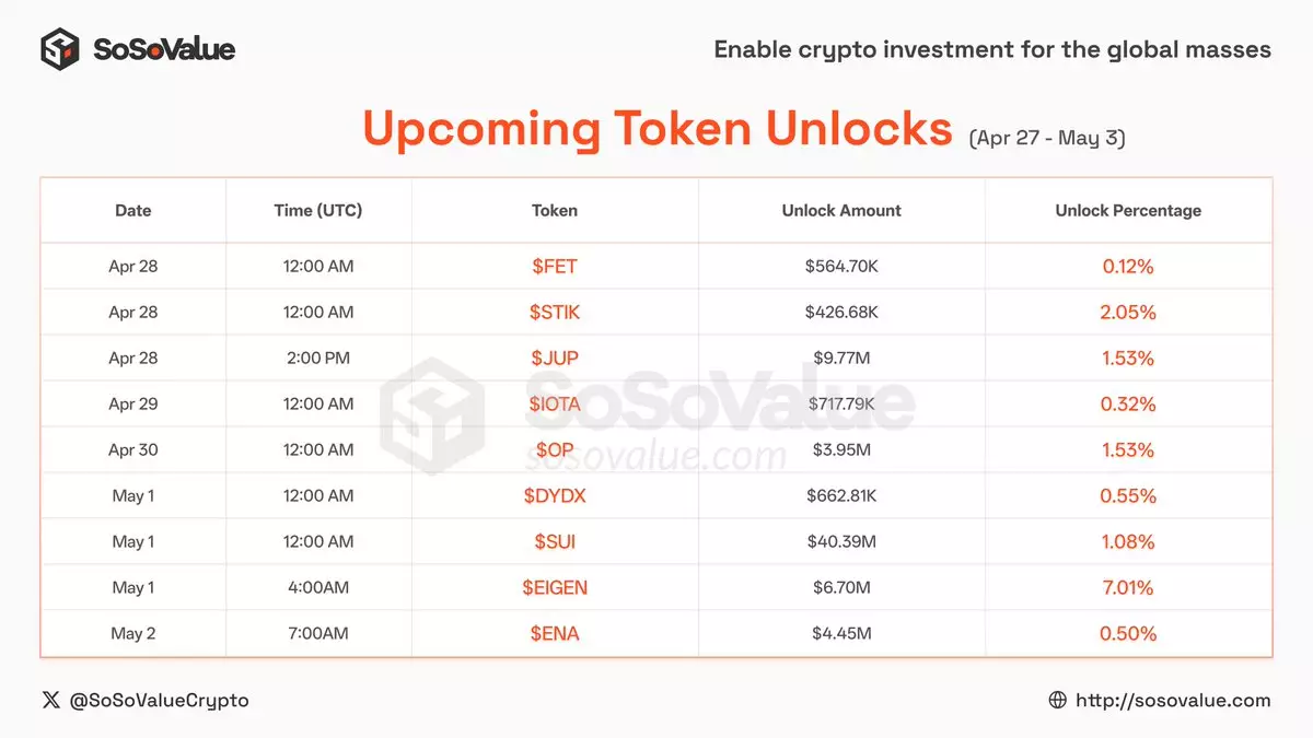 Upcoming Token Unlocks (Apr 27 - May 3) Several crypto projects will unlock tokens this week, including $FET, $STIK, $JUP, $IOTA, $OP, $DYDX, $SUI, $