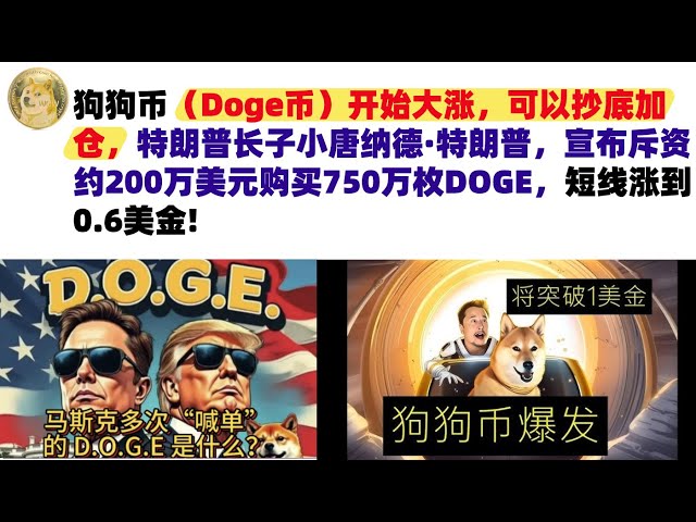 • 狗狗币(Doge币)开始大涨,可以抄底加仓,特朗普长子小唐纳德·特朗普,宣布斥资约200万美元购买750万枚DOGE,短线涨到0.6美金#DOGE币#马斯克狗狗币#DOGE行情分析