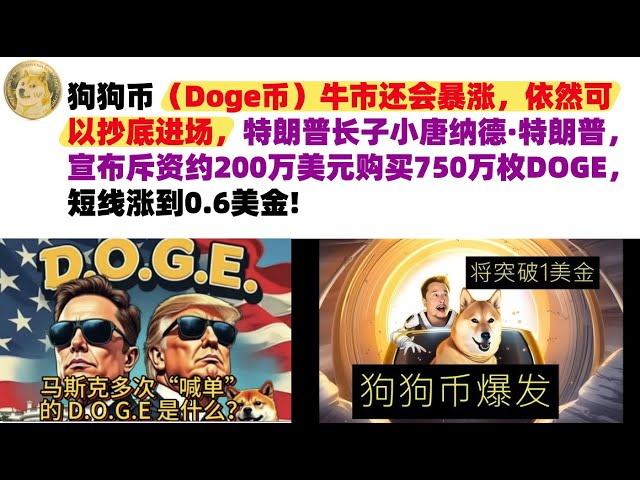 • 狗狗币(Doge币)牛市还会暴涨,依然可以抄底进场,特朗普长子小唐纳德·特朗普,宣布斥资约200万美元购买750万枚DOGE,短线涨到0.6美金#DOGE币#马斯克狗狗币#DOGE行情分析