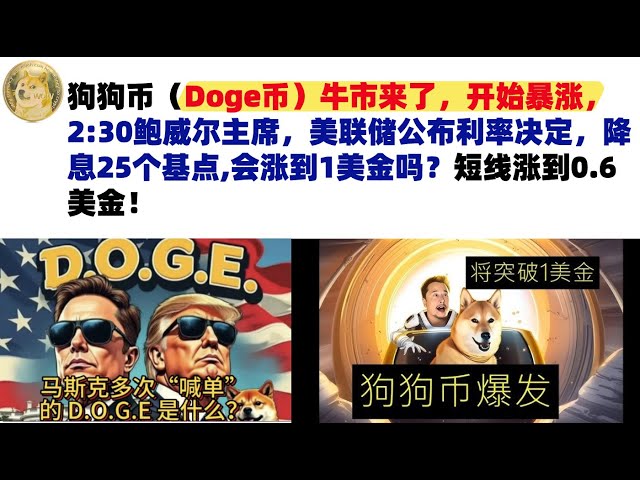 • 狗狗币(Doge币)牛市来了,开始暴涨,2:30鲍威尔主席,美联储公布利率决定,降息25个基点,会涨到1美金吗?短线涨到0.6美金#DOGE币#马斯克狗狗币#DOGE行情分析