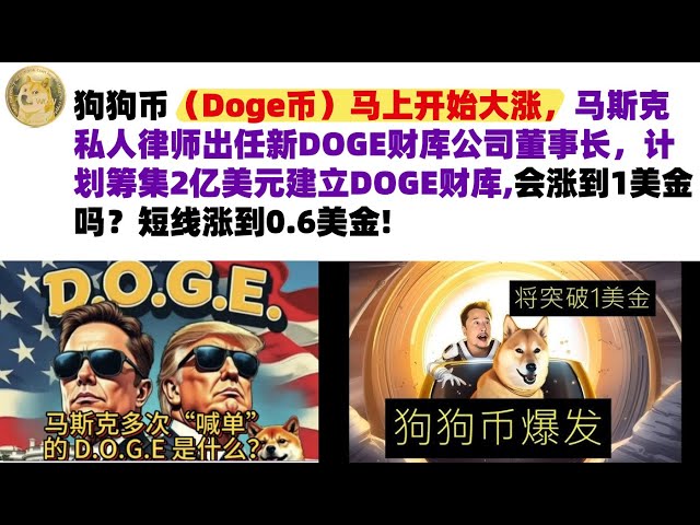 • 狗狗币(Doge币)马上开始大涨,马斯克私人律师出任新DOGE财库公司董事长,计划筹集2亿美元建立DOGE财库,会涨到1美金吗?短线涨到0.6美金#DOGE币#马斯克狗狗币#DOGE行情分析