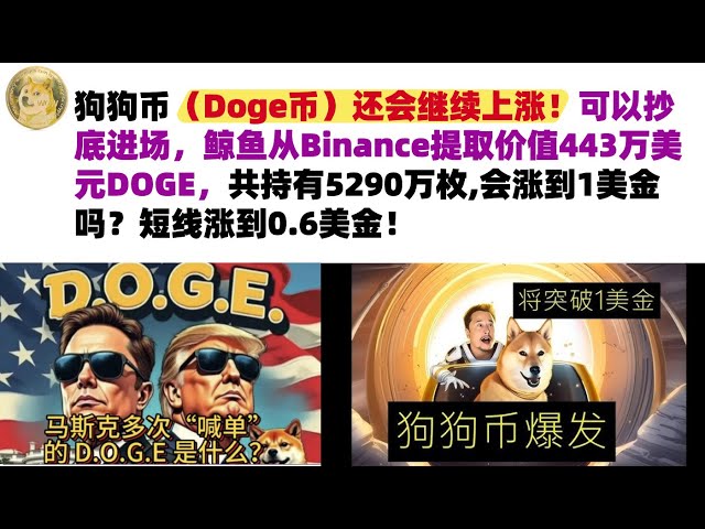 • 狗狗币(Doge币)还会继续上涨!可以抄底进场,鲸鱼从Binance提取价值443万美元DOGE,共持有5290万枚,会涨到1美金吗?短线涨到0.6美金#DOGE币#马斯克狗狗币#DOGE行情分析