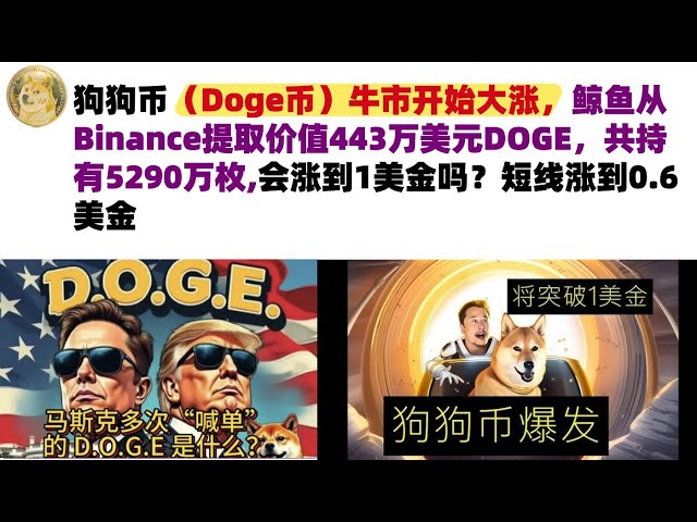 • 狗狗币(Doge币)牛市开始大涨,鲸鱼从Binance提取价值443万美元DOGE,共持有5290万枚,会涨到1美金吗?短线涨到0.6美金#DOGE币#马斯克狗狗币#DOGE行情分析