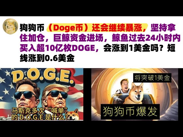 • 狗狗币(Doge币)还会继续暴涨,坚持拿住加仓,巨鲸资金进场,鲸鱼过去24小时内买入超10亿枚DOGE,会涨到1美金吗?短线涨到0.6美金#DOGE币#马斯克狗狗币#DOGE行情分析