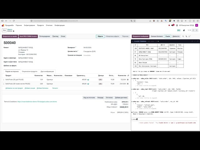 A 4-minute live demonstration of managing an Odoo 18 Sales Order entirely through conversational AI — no manual clicks in the UI. Claude Code (Opus 4.6, 1M context) uses the odoo-claude-mcp server to read the order, switch the customer, unlink a line, update quantities, and write a rich-text marketing description into the order note field — all through MCP tool calls. MCP tools used: • odoo_connections — list active connections • odoo_read — read record fields • odoo_search_read — search with filter + read in one call • odoo_write — update fields • odoo_unlink — delete records • odoo_execute — call any model method • odoo_refresh — push view reload to user's browser Highlights: • Switching customer via res.partner search + odoo_write on partner_id • Removing a sale.order.line with odoo_unlink • Updating product_uom_qty to recompute totals automatically • Writing HTML marketing content into the line note field • Error handling when RPC fails — Claude retries with corrections Audio tracks: Bulgarian (default) + English — switch in the player Subtitles: Bulgarian + English Open source: https://github.com/rosenvladimirov/odoo-claude-mcp #Odoo #ClaudeCode #MCP #AI #Automation #ERP #Opus46