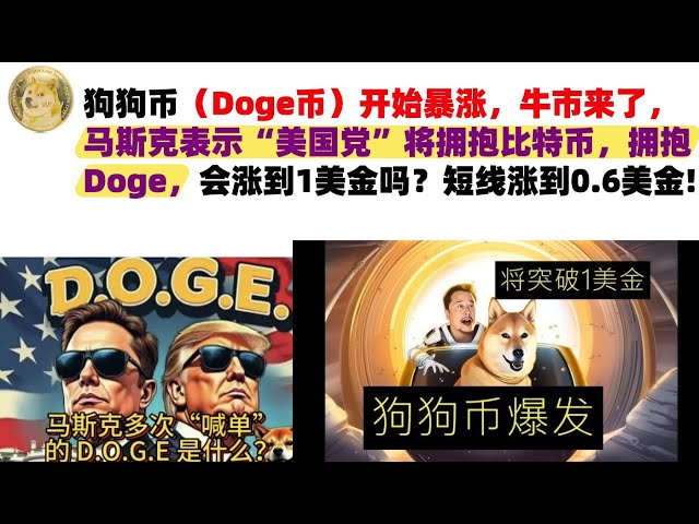 • 狗狗币(Doge币)开始暴涨,牛市来了,马斯克表示“美国党”将拥抱比特币,拥抱Doge,会涨到1美金吗?短线涨到0.6美金#DOGE币#马斯克狗狗币#DOGE行情分析!