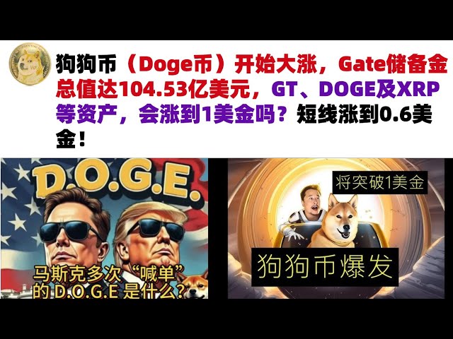 • 狗狗币(Doge币)开始大涨,Gate储备金总值达104.53亿美元,GT、DOGE及XRP等资产,会涨到1美金吗?短线涨到0.6美金#DOGE币#马斯克狗狗币#DOGE行情分析!