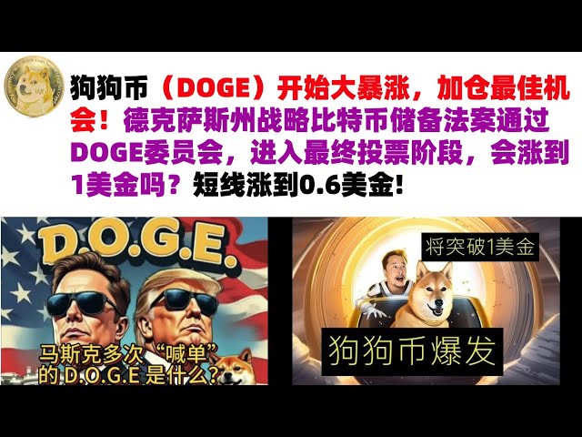 • 狗狗币(DOGE)开始大暴涨,加仓最佳机会!德克萨斯州战略比特币储备法案通过DOGE委员会,进入最终投票阶段,会涨到1美金吗?短线涨到0.6美金#DOGE币#马斯克狗狗币#DOGE行情分析!