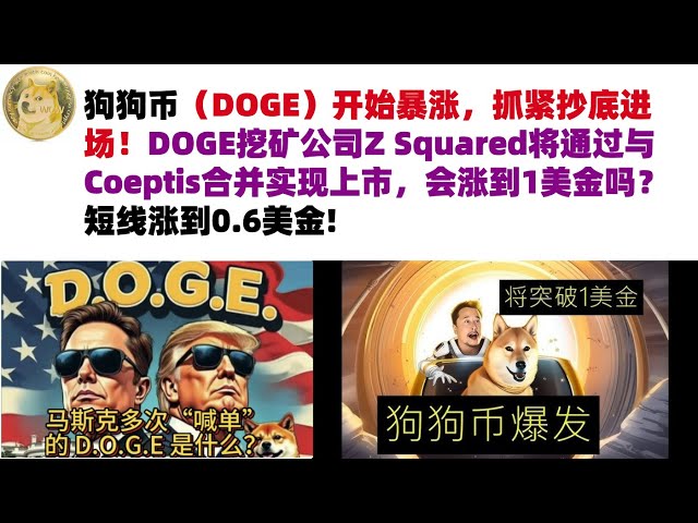 • 狗狗币(DOGE)开始暴涨,抓紧抄底进场!DOGE挖矿公司Z Squared将通过与Coeptis合并实现上市,会涨到1美金吗?短线涨到0.6美金#DOGE币#马斯克狗狗币#DOGE行情分析!