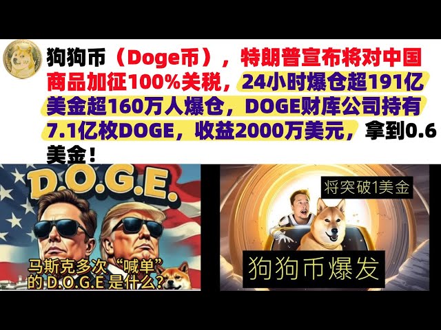 • 狗狗币(Doge币),特朗普宣布将对中国商品加征100%关税,24小时爆仓超191亿美金超160万人爆仓,DOGE财库公司CleanCore披露持有7.1亿枚DOGE,短线涨到0.6美金!