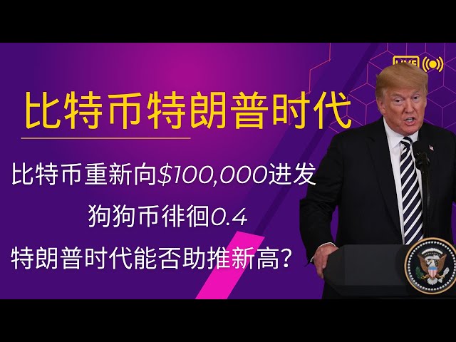 • 狗狗币 doge币 比特币 BTC 区块链 加密货币 最新行情走势分析,比特币重新向$100,000进发, 狗狗币徘徊0.4, 特朗普时代能否助推新高?