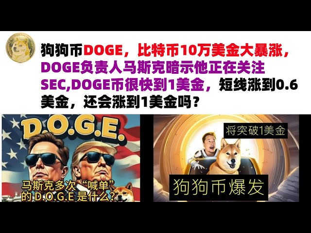 • 狗狗币DOGE,比特币10万美金大暴涨,DOGE负责人马斯克暗示他正在关注SEC,DOGE币很快到1美金,短线涨到0.6美金,还会涨到1美金吗?马斯克狗狗币|DOGE行情分析!