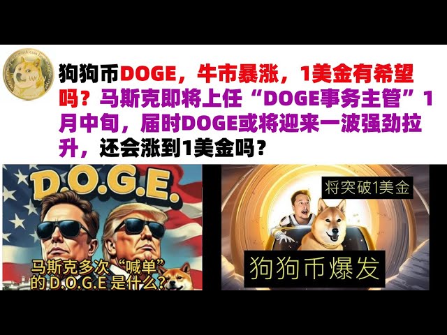 • 狗狗币DOGE,牛市暴涨,1美金有希望吗?马斯克即将上任“DOGE事务主管”1月中旬,届时DOGE或将迎来一波强劲拉升,短线涨到0.6美金,还会涨到1美金吗?马斯克狗狗币|DOGE行情分析!
